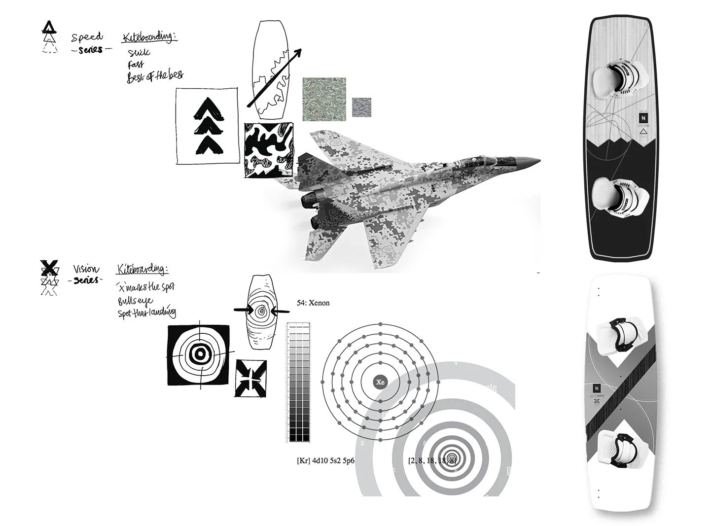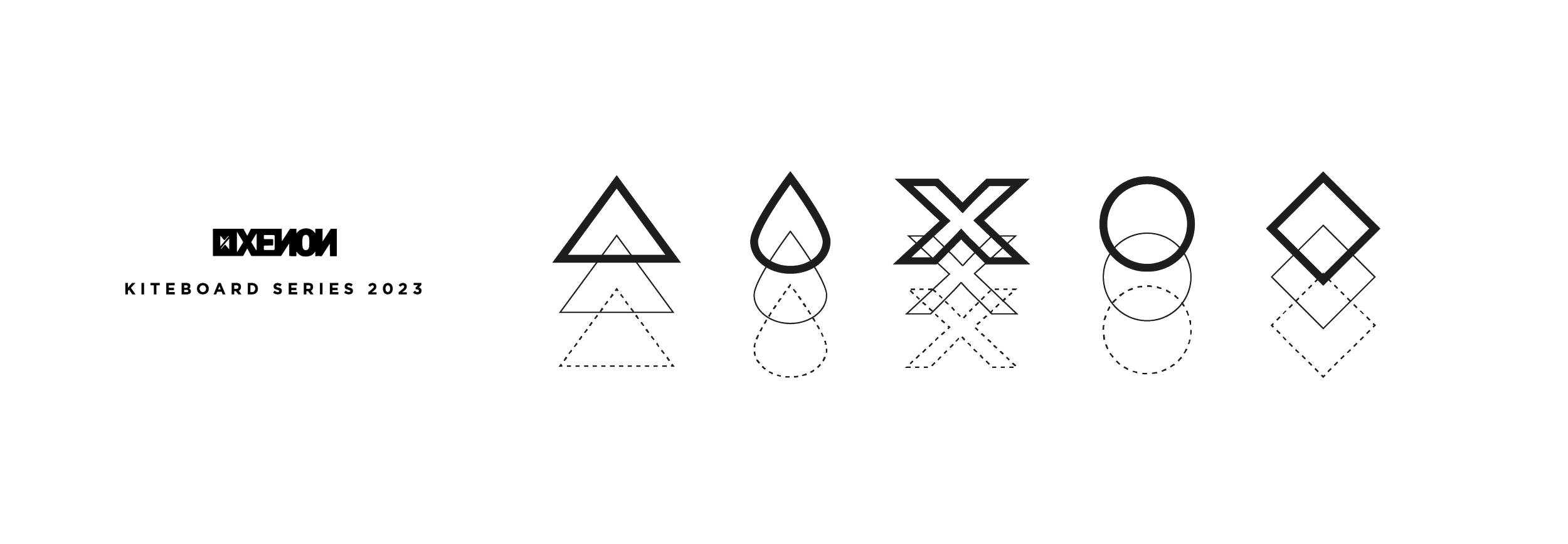 Our primary objective was to break from the traditional approach to kiteboard design, based purely on aesthetic. To do this we build a concept for each board design. We focussed on an element, something specific to the sport, a technique, a feeling, something Kiters could relate too. We then created a unique emblem for each board that would exist as a family of products, a range. An abstracted identity that kiteboarders could make their own. To honour the Xenon style and to not alienate existing customers we kept the designs clean and minimal.